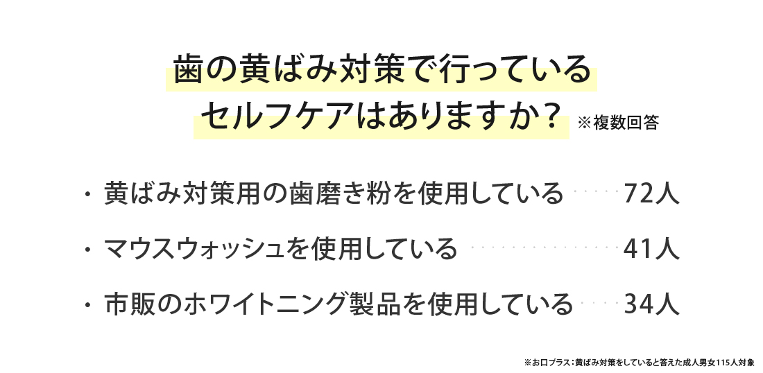 先ほどのアンケートで「はい」と回答した115人に、「歯の黄ばみ対策で行っているセルフケアはありますか?」という質問を実施しました。